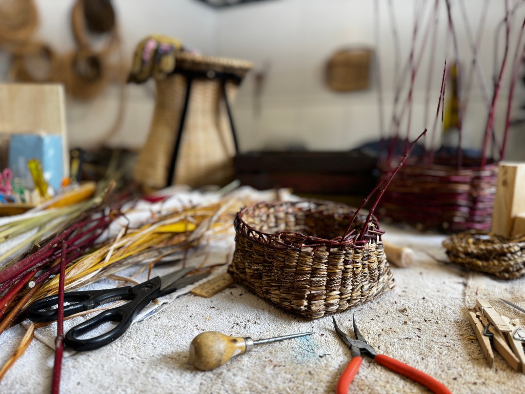 We moved to the woods of Northern Michigan in 2023, a beautiful place we call “Wilderwood.” The first owners of Wilderwood planted a wealth of plants and flowers among the white pines, birch, wild willow and dogwoods. Seeing this bounty from nature, I rekindled my passion for basket making using the dried flower leaves, bark, vines, and willow and dogwood withies. I am always being inspired to find ways to use the multitude of pine cones and fallen branches for wreaths and branch weavings.